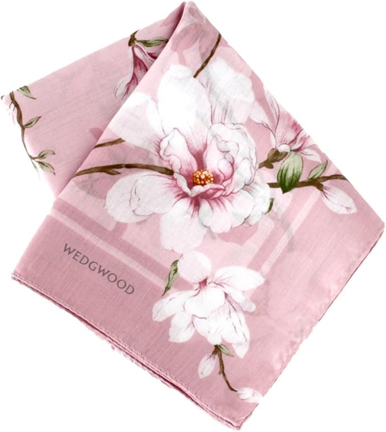【WEDGWOOD】柔らかな青と白が美しいストーンウェア【マグノリア】(モクレン)をモチーフにした大判プリントハンカチです。しわになりにくい形態安定加工が施されているので、洗濯後のお手入れも簡単です。