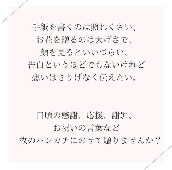 【ちょっとした贈り物】ちょっとお世話になったとき。いただきものをもらったとき。相談にのってもらったとき。ひさしぶりの友人に会うとき。そんな“ちょっとしたプレゼント”をする機会、結構ありますよね。そんなときには、相手の負担にならずにさりげなく気持ちが伝わる、ハンカチーフです。