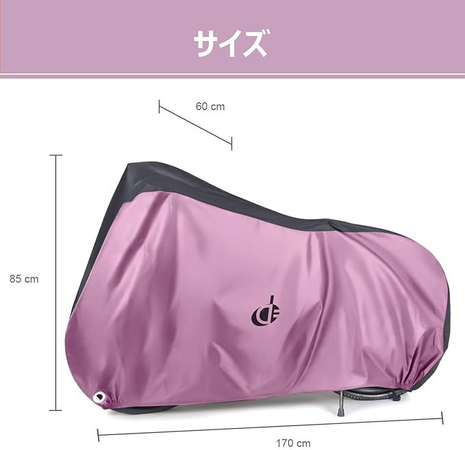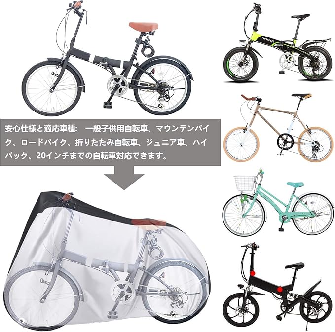 【安心仕様】:約170cm x 85cm x 60cm。立体裁断と絞りゴムより、風の侵入を防止、自転車にすっぽりと被せます。20インチまでの自転車に対応。サイクルカバーと同じの高品質素材の収納袋も付属されており、未使用時や持ち運びの際は専用ケースにコンパクトに収納できます。