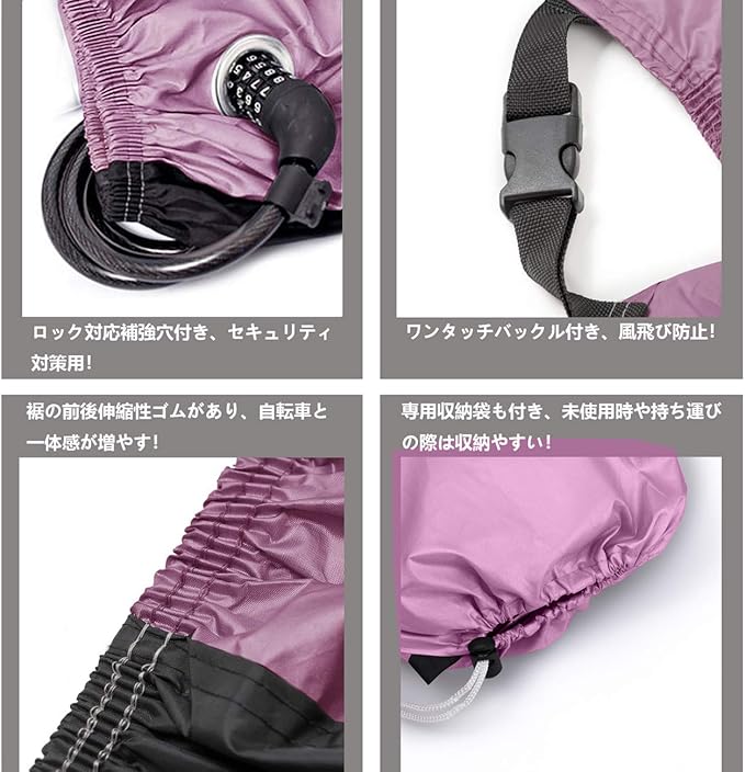【強風・セキュリティ対策用の安心仕様】:前後の底部は伸縮性ゴムで作られ、調節できる風飛び防止ワンタッチが付き、有効的に風飛びを防止します。前輪にはロック対応補強穴が2つあります、様々なロックにマッチできます、カバーと自転車の一体感が増やすことができます。それに、風で飛ばされることなく、盗難対策もバッチリです。