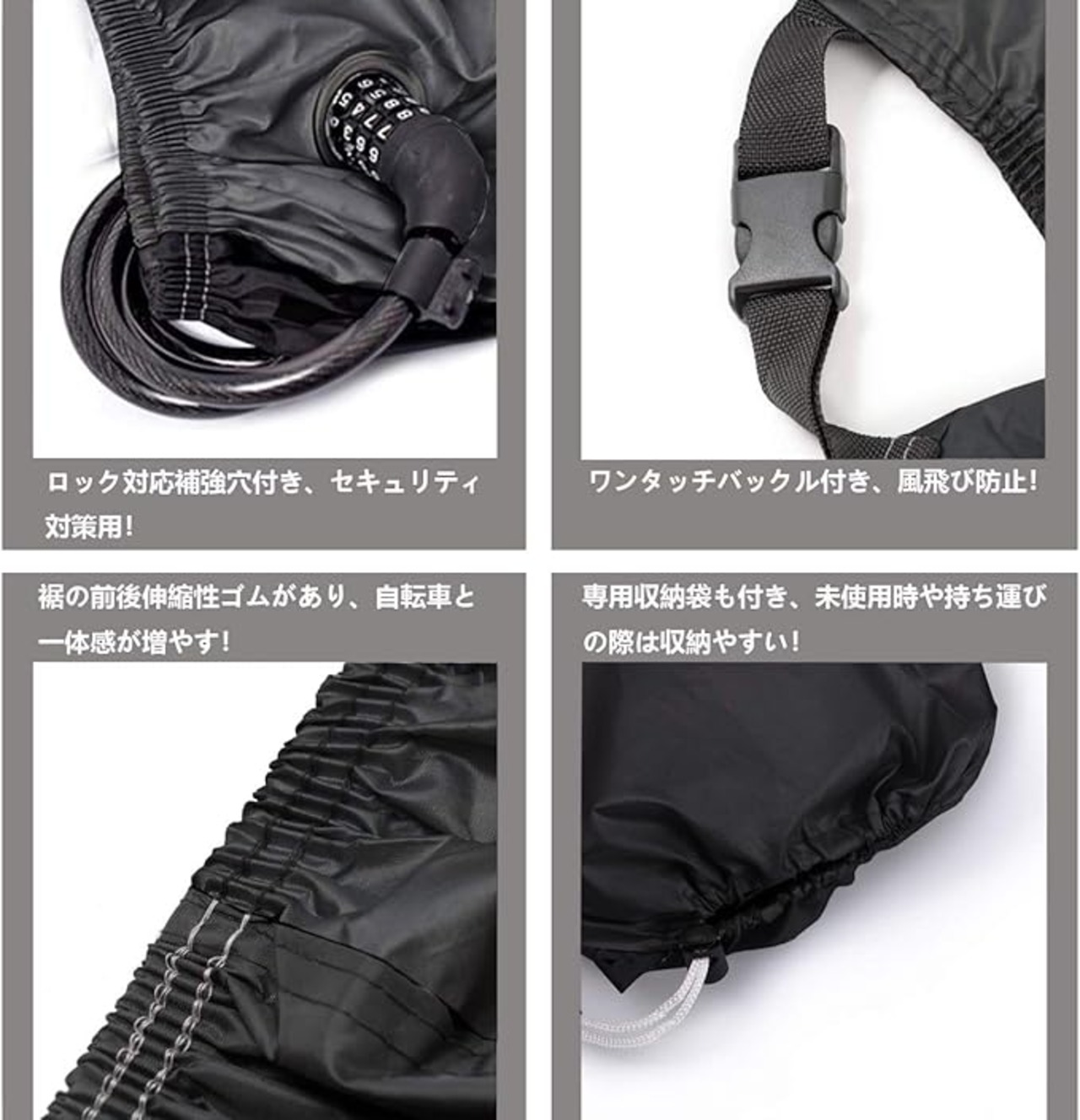 【強風・セキュリティ対策用の安心仕様】:前後の底部は伸縮性ゴムで作られ、調節できる風飛び防止ワンタッチが付き、有効的に風飛びを防止します。前輪にはロック対応補強穴が2つあります、様々なロックにマッチできます、カバーと自転車の一体感が増やすことができます。それに、風で飛ばされることなく、盗難対策もバッチリです。