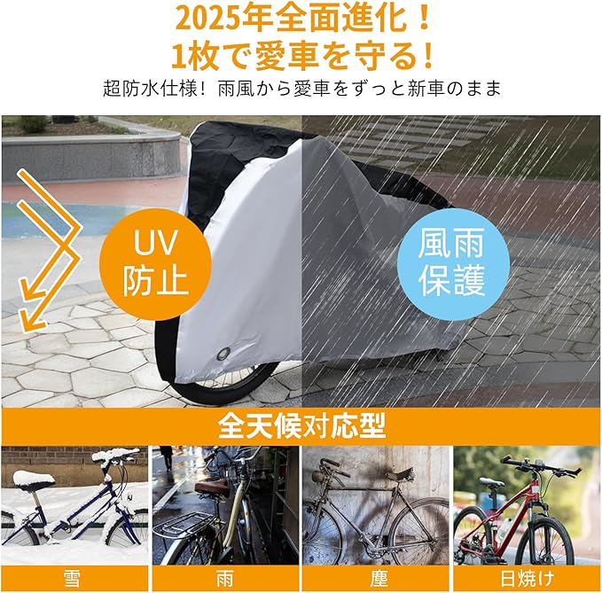 【防褪色&UVカット】この生地は紫外線防止とシルバーコーティング加工が施されており、優れた紫外線防止機能を備えています。紫外線カット指数はUV50+、防褪色レベルは5級です。これにより、自転車の表面への紫外線によるダメージを軽減し、塗装面や部品の耐用年数を効果的に延ばします。屋外での長期保管にも最適です。