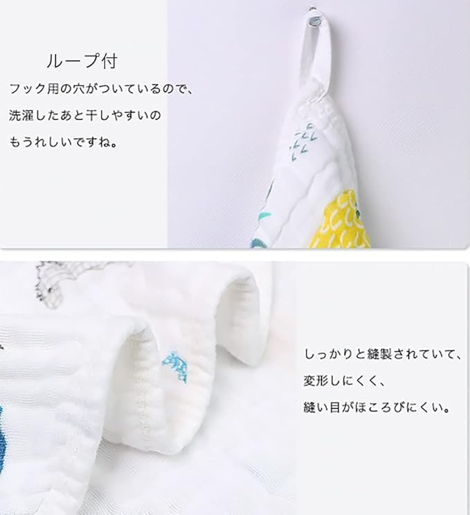 子育てが楽になるガーゼタオル。ハンカチ、赤ちゃんのガーゼタオル、よだれかけ、ベビービブとしては大活躍。特に保育園や幼稚園での使用に便利なデザインが特徴です。