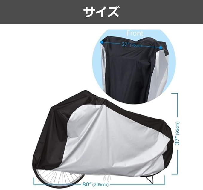 【商品仕様】大判サイズで27インチ自転車や原付に対応し、丈夫なポリエステル素材を採用。【自転車・バイク用カバー】雨や雪、直射日光やホコリから愛車を守る頼れるガードカバー。【取り付け・取り外し簡単】前後ゴム入りでフィット感抜群、掛け外しもラクにできる便利設計。【はっ水加工で水をはじく】水をしっかり弾き、汚れもサッと拭くだけで清潔を保てるカバー。【商品サイズ】205cm x 95cm x 70cm【購入後の安心のサポート】万が一、商品に不具合があった場合には、購入後30日間は責任を持って返品・返金対応をさせて頂きます。安心してお買い求めください。