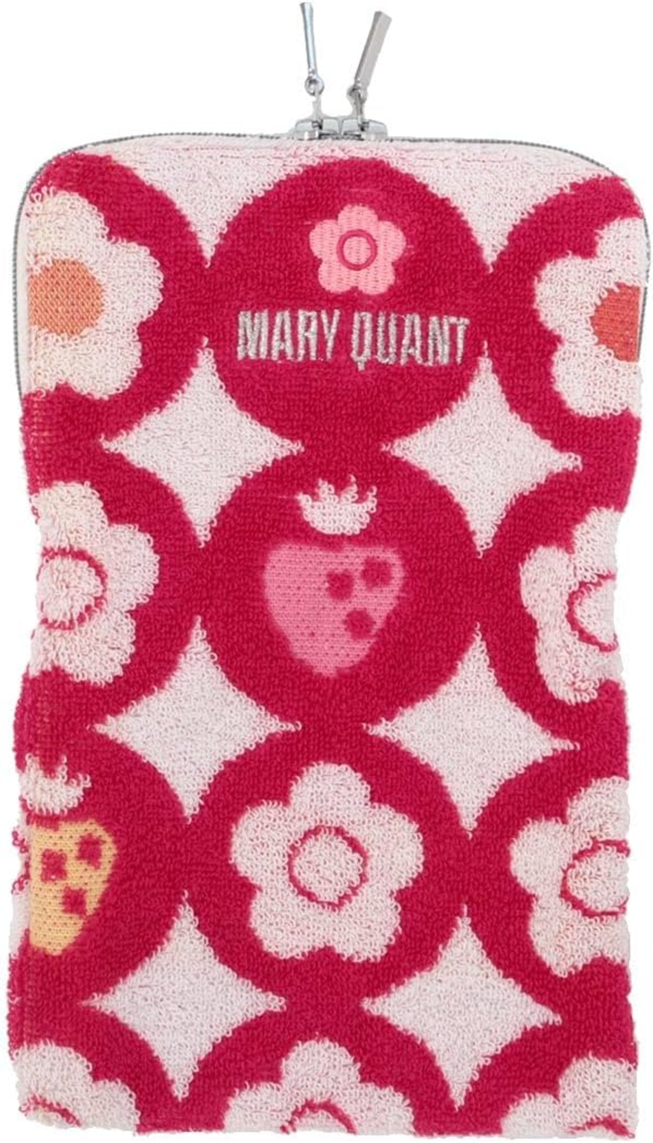 【MARY QUANTのファスナー付きタオル】ブランドアイコンの""デイジー""とイチゴがカラフルに表現されたファスナー付きタオルです。キラッと光るロゴ刺繍もポイント。 ペットボトルだけでなく、歯ブラシなどの小物やマスクを入れるのにも便利なアイテム。洗濯できるのでいつも清潔に持ち歩けます。