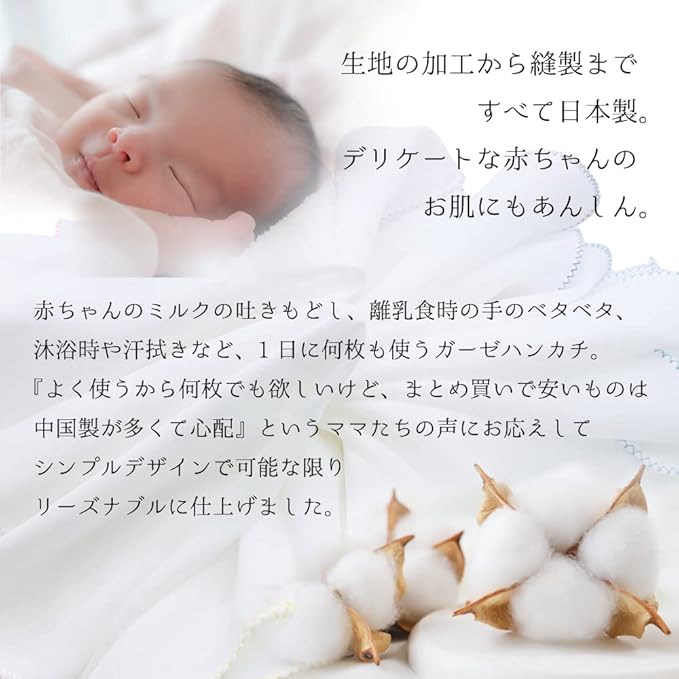 ふんわりやわらかな綿100%のガーゼハンカチ 。お肌がデリケートな赤ちゃんにもあんしんして使ってほしいから、生地の加工から縫製まですべて日本製に拘りました。 ミルクの吐きもどし、離乳食時の手のベタベタ、沐浴時や汗拭きなど、1日に何枚も使うガーゼハンカチ 。 『よく使うから何枚でもほしいけど、まとめ買いで安いものは中国製が多くて心配』というママたちの声にお応えして、シンプルなデザインで可能な限りリーズナブルに!ふちどりはメロー縫製で丁寧に仕上げました。