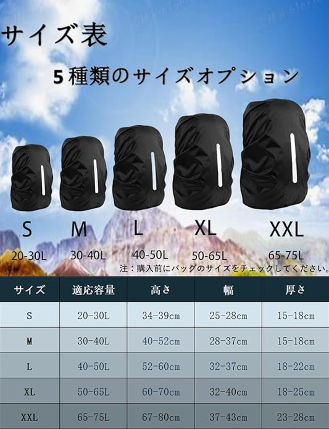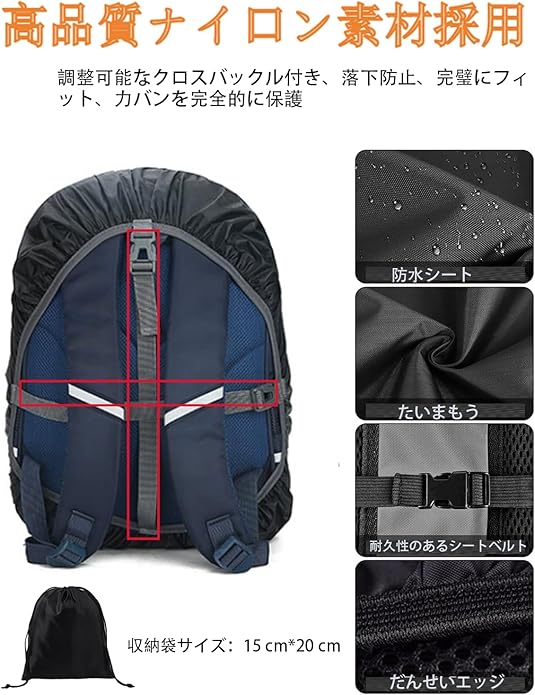 【商品内容】リュックカバー*1, 収納袋付き、簡単でカバーが収納できます。通勤、通学、旅行、アウトドアで携帯便利です。サイズ:S;20-30L、 M:30-40L 、L:40-50L 、XL:50-65L、XXL:65-75L。