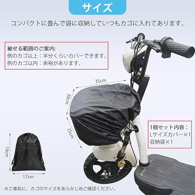 【便利用品・カバー仕様】・品名:自転車カゴカバー ・平置きサイズ:約54 47cm ・カバー範囲案内:約35 30 25cm以内のかごであれば余裕がありますが、それ以上のサイズのかごでは一部しか覆えない場合があります。・セット内容:Lサイズ防水カバー 2、収納袋 1。※ご購入前にカゴのサイズをご確認ください。万が一、前かごカバーに品質等の問題がございましたら、「店名」-「質問する」からサポートをご利用ください。