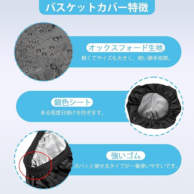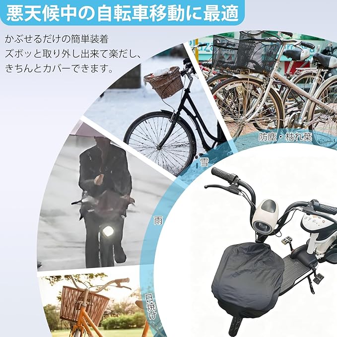 【多用途対応・かぶせるだけ】工具不要で、かぶせるだけの簡単装着。自転車や電動アシスト自転車の前かごはもちろん、雨の日には臨時の座席カバーやリュックカバー、バッグカバーとしても使用可能です。※裏側の銀色シートは使用状況や経年により徐々に劣化する場合があります。また、かごや荷物のサイズによっては完全に覆えない場合がありますので、あらかじめご了承ください。