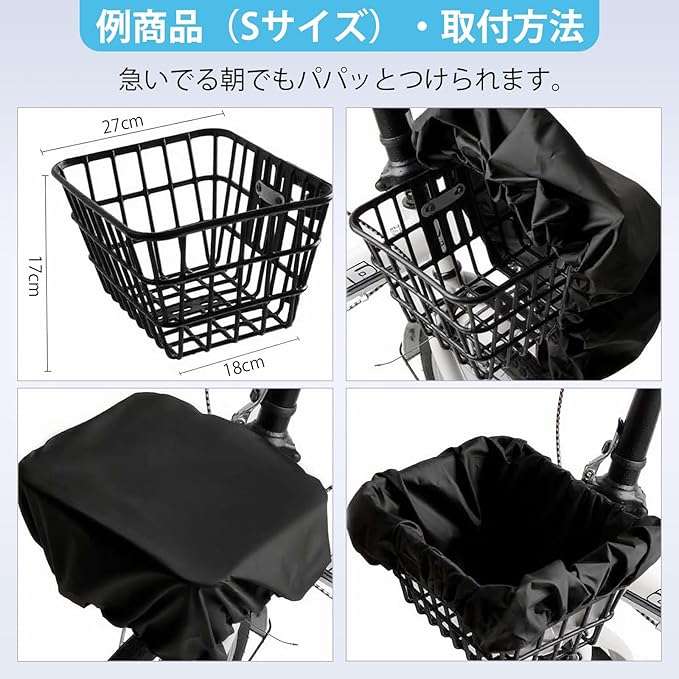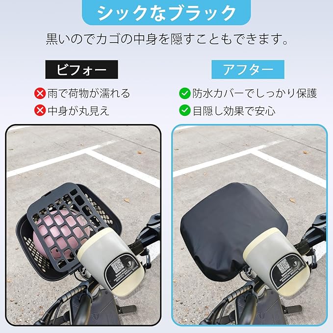 【黒い外観・目隠し可能】かごの上からそのまま被せれば、防水カバーとして荷物を雨から守ります。黒いのでカゴの中身を隠すこともでき、プライバシー保護にも役立ちます。裏返してかごの内側に敷けば、細かい荷物の落下防止にもなります。