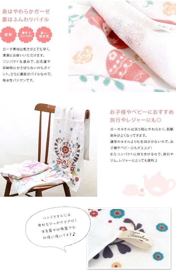 ハンドタオルには便利な引っ掛けタグ付きのため、保育園や幼稚園、キッチンやトイレでも便利にお使いいただけます。