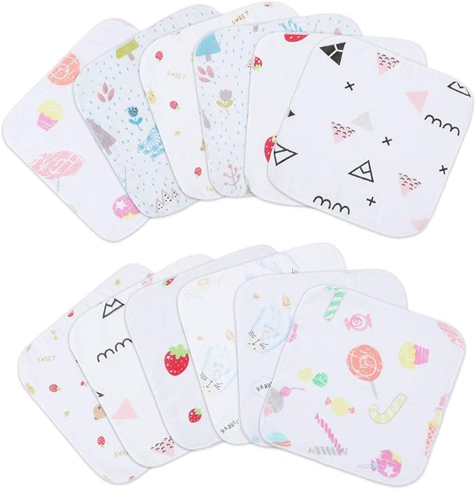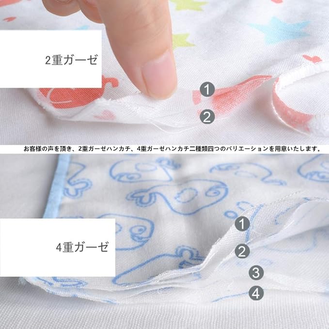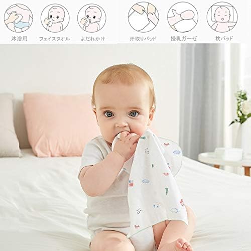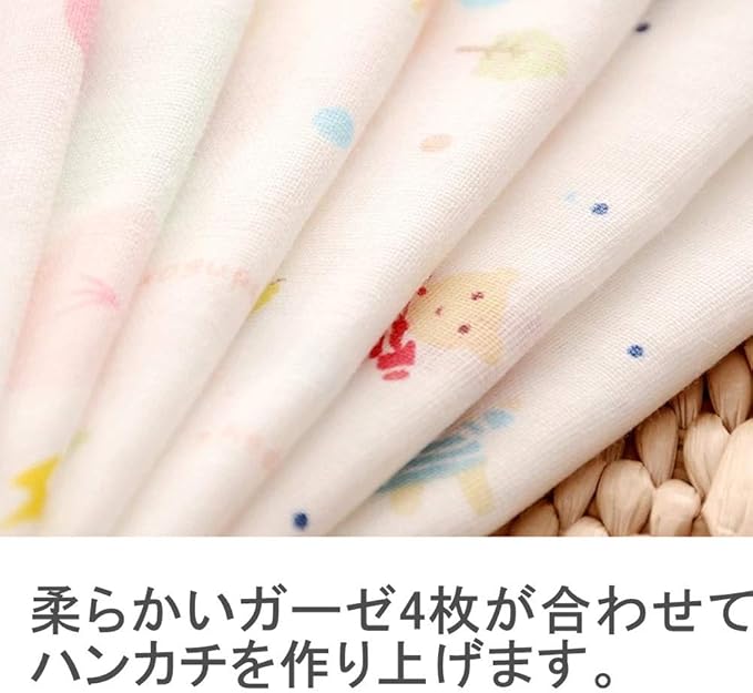 サイズ:18cm*18cm。素材:綿100% ダブルガーゼ生地(裏は白地)。ふちかがり糸:ポリエステル100%。一枚一枚検品済み。1セットに5柄各2枚。柄は弊社にお任せ。電車、恐竜、キリンなど子供の中で大人気なキャラクター柄