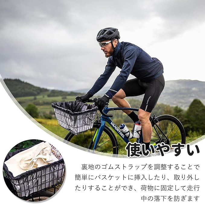 【使いやすい】バスケットライナーには伸縮性のあるストラップが付属しており、バスケットへの取り付けや取り外しが簡単にできる。また、バスケットライナーは、自転車バスケットの隙間から荷物が落下するのを防ぎ、バスケットに固定する。