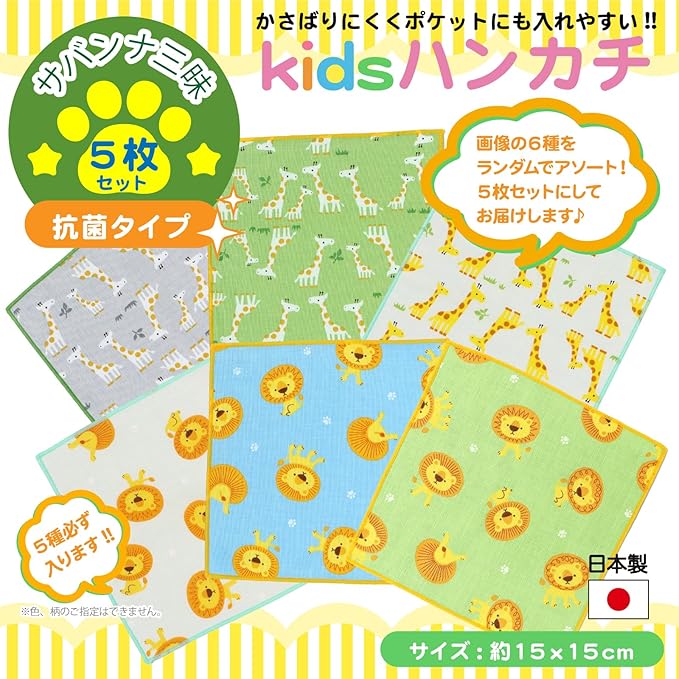 [cluster] キッズハンカチ 【完全日本製】 綿100 ガーゼハンカチ かわいい柄 (抗菌ミニハンカチ5枚/サバンナ三昧セット)