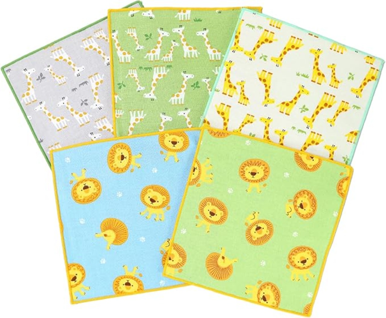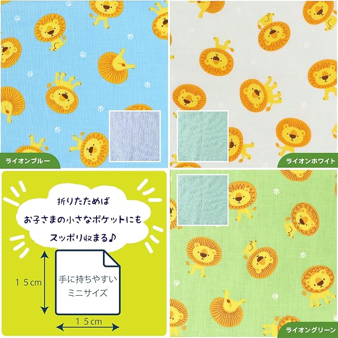 【裏地抗菌タイプ キッズミニハンカチ5枚/サバンナ三昧セット】全6種(ライオングリーン・ライオンブルー・ライオンホワイト・キリンホワイト・キリングリーン・キリングレー)の中から、ランダムで5種をアソートしてお届けします。※柄のご指定はできません予めご了承ください。
