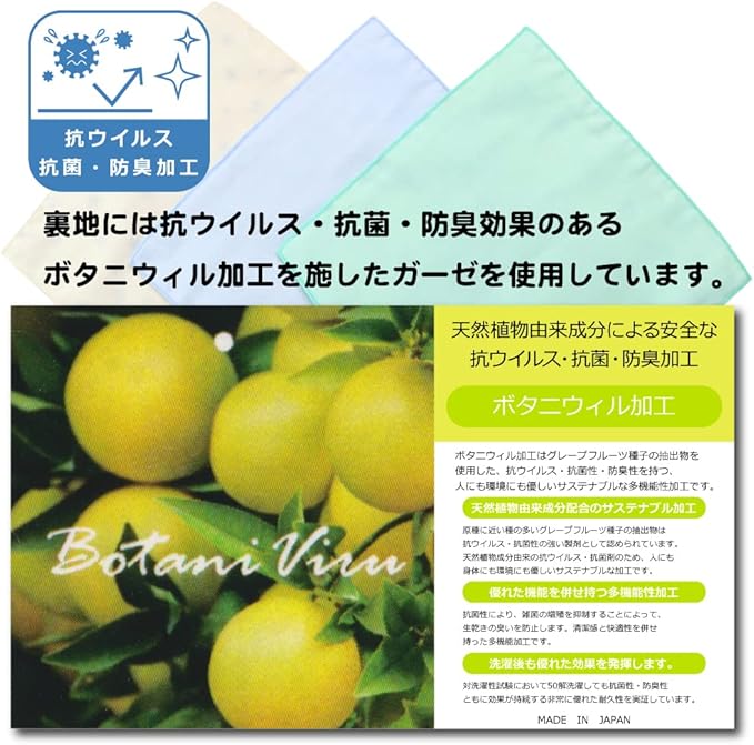 裏地:天然植物由来成分による安全な抗ウイルス・抗菌・防臭効果のあるボタニウィル加工ガーゼ使用。