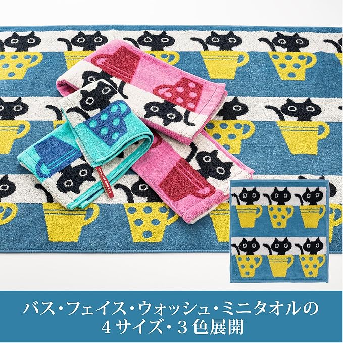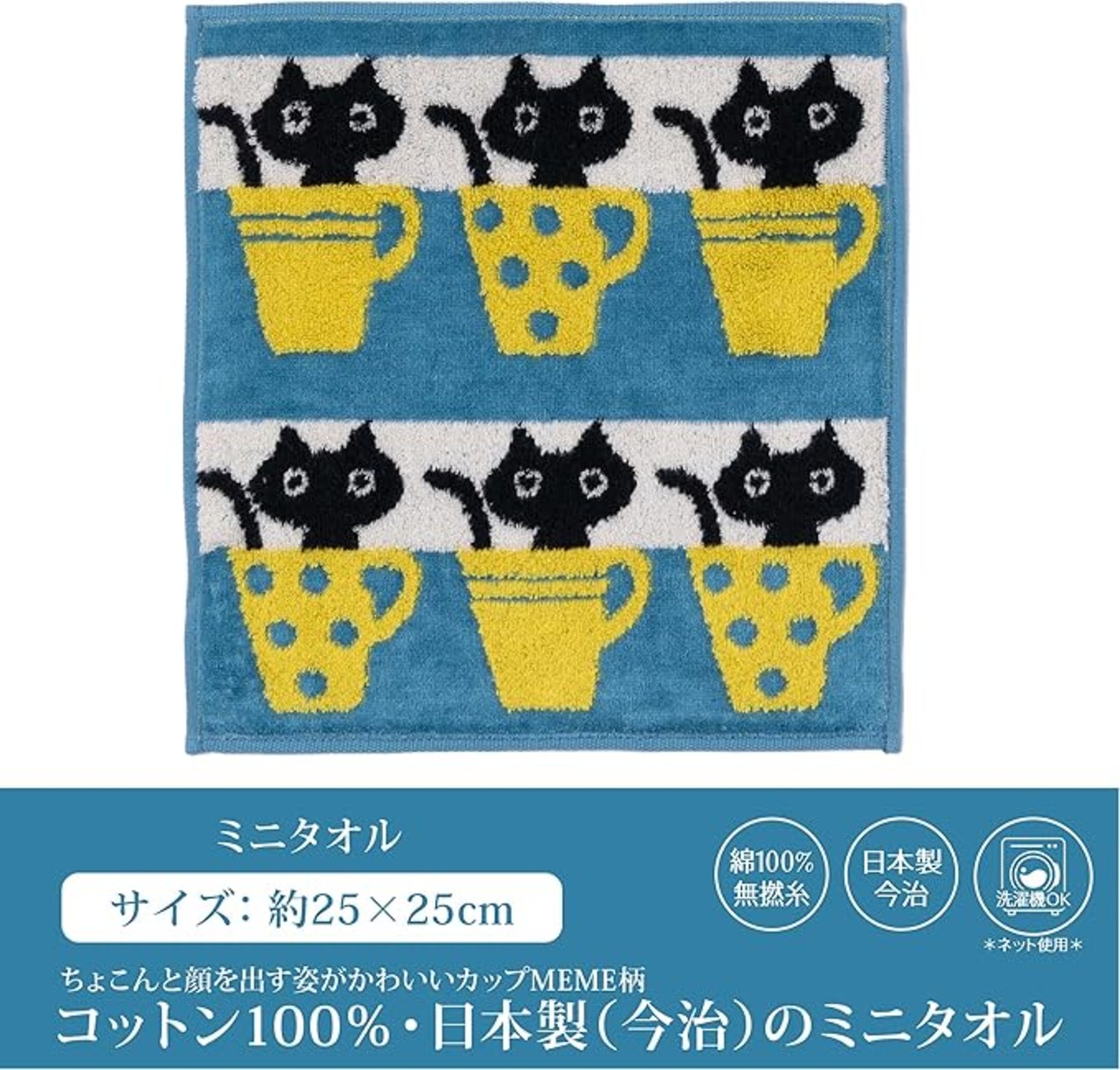 カップからちょこんとのぞくMEMEが可愛らしい「カップMEME」柄。シンプルなデザインの中に遊び心が光ります。猫好きさんにはたまらない、キュートなタオルです。