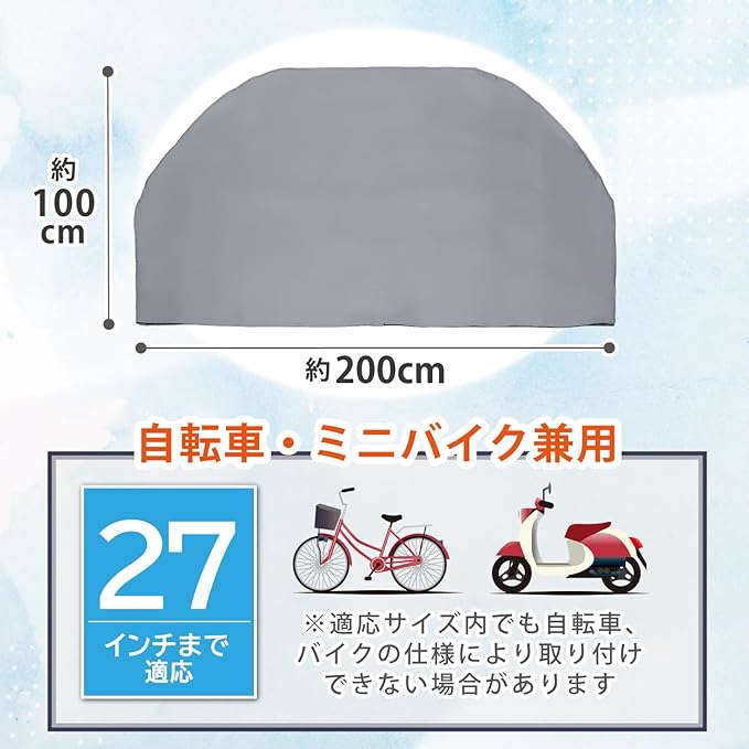 【商品仕様】:サイズ/約幅200 高さ100cm、カラー/シルバー、内容/1枚、適応サイズ/27インチまで対応、ミニバイク(原動機付自転車)兼用、材質/PEVA