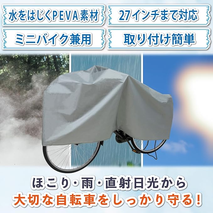 アストロ 自転車カバー PEVA素材 大切な自転車を直射日光・雨・雪などから守る 原付(ミニバイク)兼用 27インチまで対応 シルバー 厚手 丈夫 雨避け 盗難防止 風飛び防止 着脱簡単 サイクルカバー 防犯 防塵 530-27
