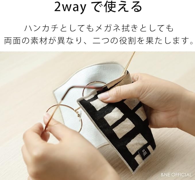 ハンカチとしてもメガネ拭きとしても両面の素材が異なり、二つの役割を果たします。