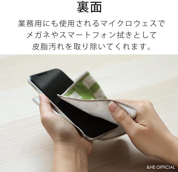 表面は普通のハンカチとして、手を拭いたり汗を拭ったり。裏面は業務用にも使用されるマイクロウェスでメガネやスマートフォン拭きとして皮脂汚れを取り除いてくれます。