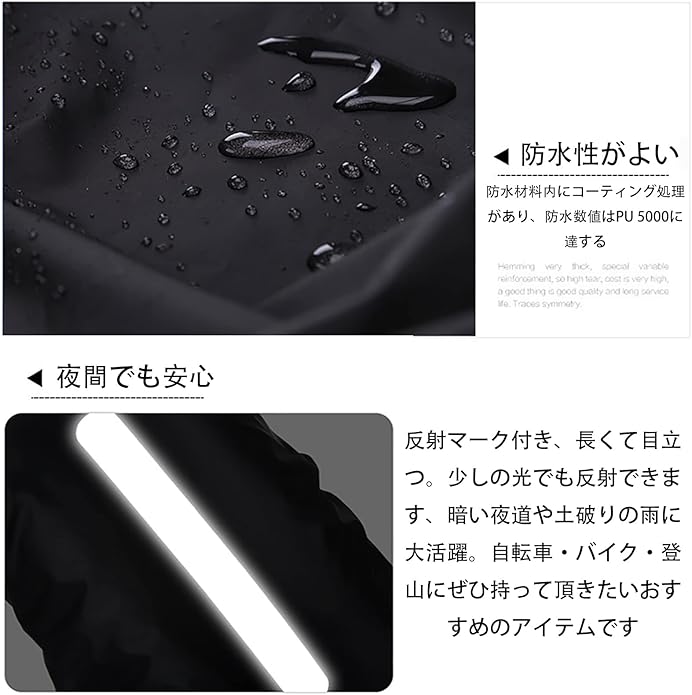 【耐久性に優れている】当社のレインカバーは高密度の190 Tナイロンの防水表面とPUコーティングを採用し、防水性と耐摩耗性が強く、摩擦などの傷付きを防止しています。