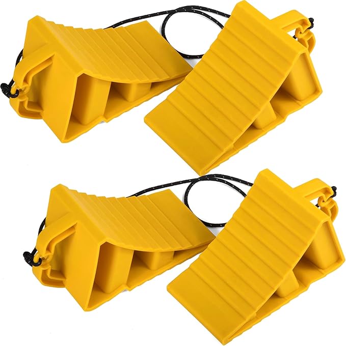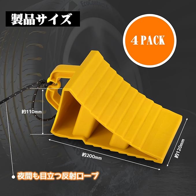 JiiinMiiin 車輪止め タイヤ止め タイヤストッパー 蛍光ロープ付き ハンドル設計 輪止めブロック 駐車場 キャンプ トラック 車両固定用 プラスチック製 黄色 4個セット 耐荷重4トン