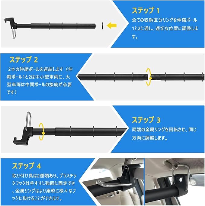 【工具不要・簡単取付で誰でも安心設置】:特別な工具は一切不要!取り付けはわずか数分で完了し、誰でも簡単に安全に設置できます。引き込み式の設計により、必要ないときはコンパクトに収納可能。車用収納バーとしての使い勝手が抜群です。