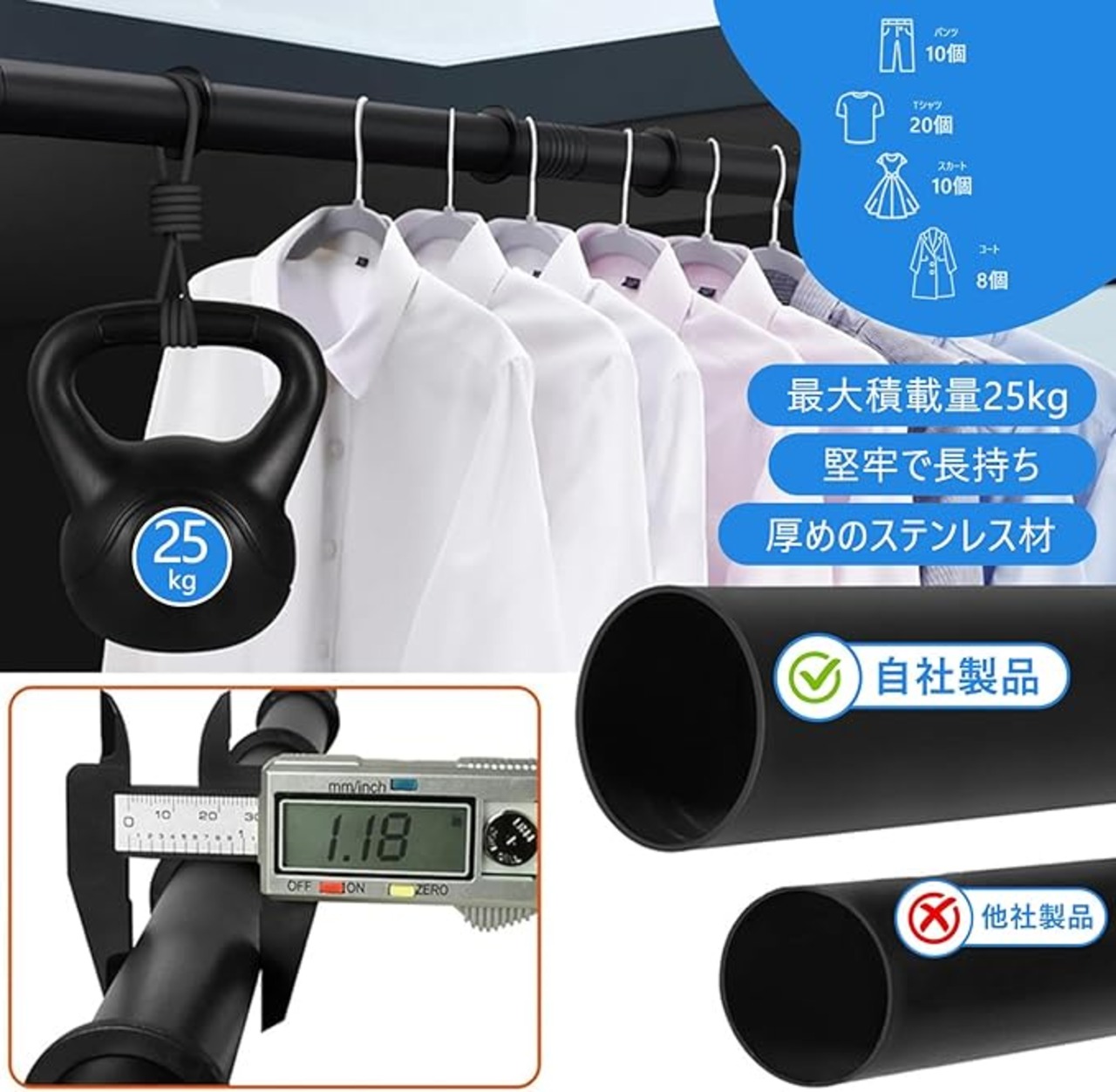 【最大22kg耐荷重の頼れる強度】:一本あたり22kgまでの重量をしっかりサポート。衣類ハンガーや釣り竿置きだけでなく、バッグやアウトドアギアなども安心して吊るせます。耐久性と安全性を兼ね備えた高品質なハンガーポールです。