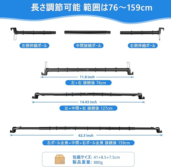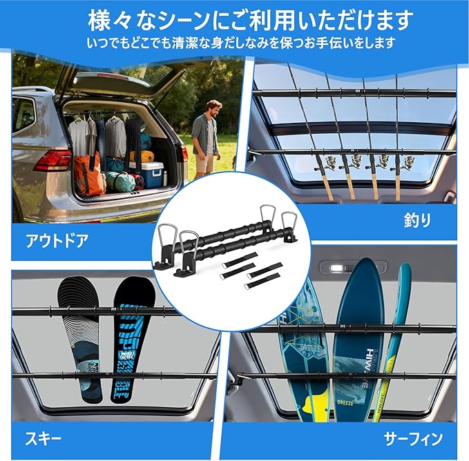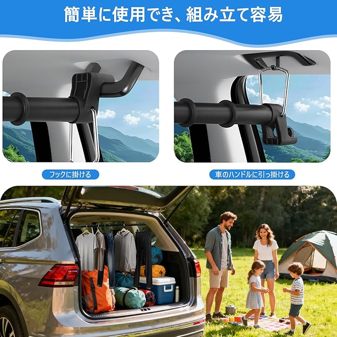 【伸縮自在の多機能バーで快適な車中泊を実現】:この車用ハンガークロスバーは76-159cmの範囲で自由に伸縮可能。車内インテリアに合わせて簡単に調整でき、さまざまな車種に対応します。天井収納として活用すれば、荷物の整理が格段に楽になり、車中泊の必需品としても最適です。