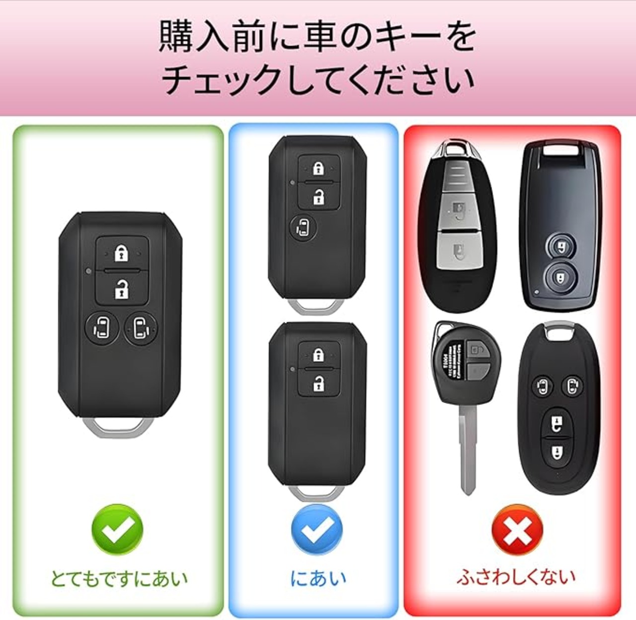 【専用設計で確実なフィット感】 本品はスズキの両側スライドドアを採用した4ボタンタイプのスマートキーにぴったり合う専用設計です。主な対応車種:新型ソリオ / ソリオ バンディット (2020年11月〜)、新型スペーシア、新型スペーシアカスタム、フレアワゴン (2018年2月〜)、新型スイフト、新型ワゴンR / ワゴンRスティングレー (MH35S/MH55S)、クロスビー (XBEE) MN71S、新型ジムニー (JB64W)、新型ジムニーシエラ (JB74W)、新型ハスラー、新型ワゴンR (MH95S) など。※ご利用のキー形状が写真と同一かご確認ください。