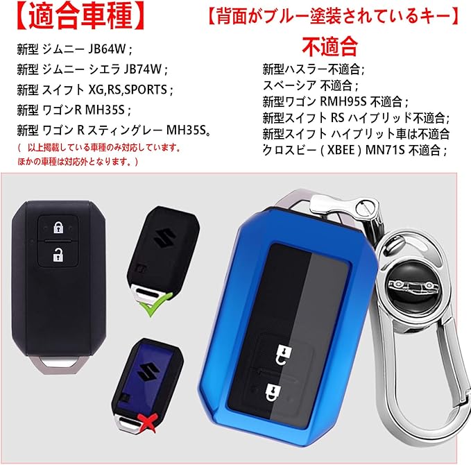 【適用な車型】適合:スズキSUZUKI 新型 ジムニー JB64W ; 新型 ジムニー シエラ JB74W ; 新型 スイフト XG,RS,SPORTS ; 新型 ワゴンR MH35S ; 新型 ワゴンRスティングレー MH35S ; 以上掲載している車種のみ対応しています。ほかの車種は対応外となります。 【背面がブルー塗装されているキー不適合】