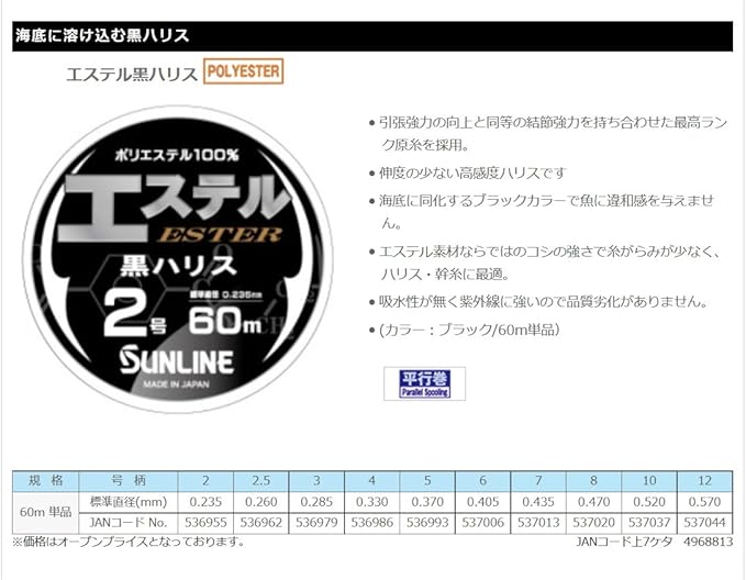 ●引張強力の向上と同等の結節強力を持ち合わせた最高ランク原糸を採用。 ●伸度の少ない高感度ハリスです ●海底に同化するブラックカラーで魚に違和感を与えません。 ●エステル素材ならではのコシの強さで糸がらみが少なく、ハリス・幹糸に最適。 ●吸水性が無く紫外線に強いので品質劣化がありません。