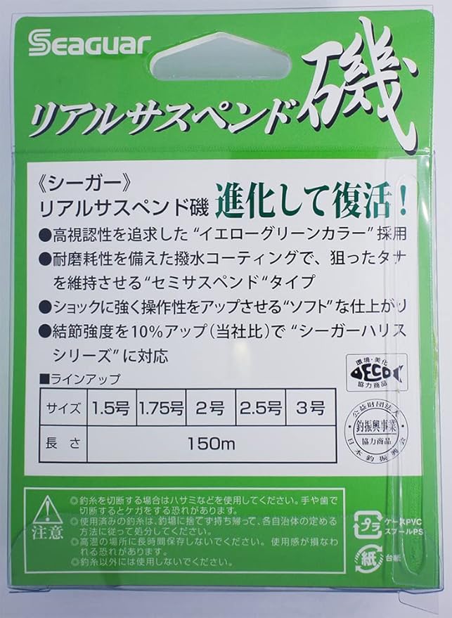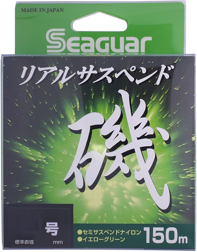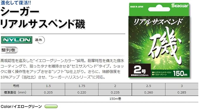 クレハ/KUREHAリアルサスペンド磯◆長さ:150m◆カラー:イエローグリーン★高視認性を追及した”イエローグリーンカラー”採用。耐摩耗性を備えた撥水コーティングで、狙ったタナを維持させる”セミサスペンド”タイプ。ショックに強く操作性をアップさせる“ソフト”な仕上がり。さらに、結節強度を10%アップ(当社比)させ、”シーガーハリスシリーズ”に対応。