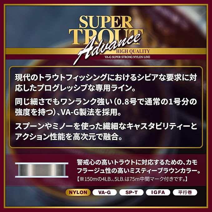 カモフラージュ性の高いミスティーブラウンカラーと高密度分子結合製法(VA-G製法)により同強度でワンランク細いラインはプレッシャーによって非常にナーバスになったトラウトたちの警戒心を和らげ繊細なスプーンのキャスタビリティーとミノーへのアクション性能を高次元で融合