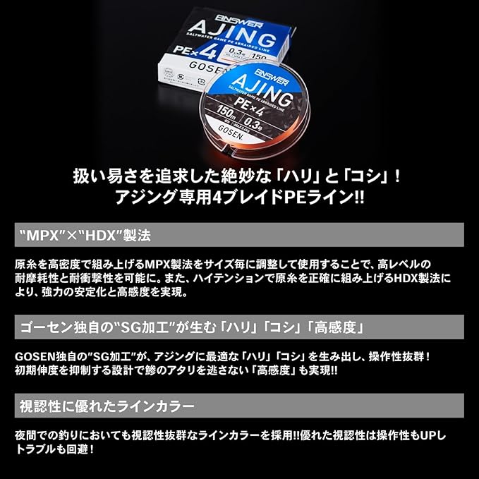 シリーズ: 【アンサー アジング PE 4 】……アジング専用4ブレイドPEライン!アジングに最適・扱い易さを追求した絶妙な「ハリ」と「コシ」を持ち、操作性抜群!初期伸度を抑制する設計で鯵のアタリを逃さない「高感度」も実現! 「MPX製法 , HDX製法」で高レベルの耐摩耗性・耐衝撃性・高感度・強力の安定化を実現!夜間での釣りにおいても視認性抜群なラインカラーを採用!!優れた視認性は操作性もUPしトラブルも回避!
