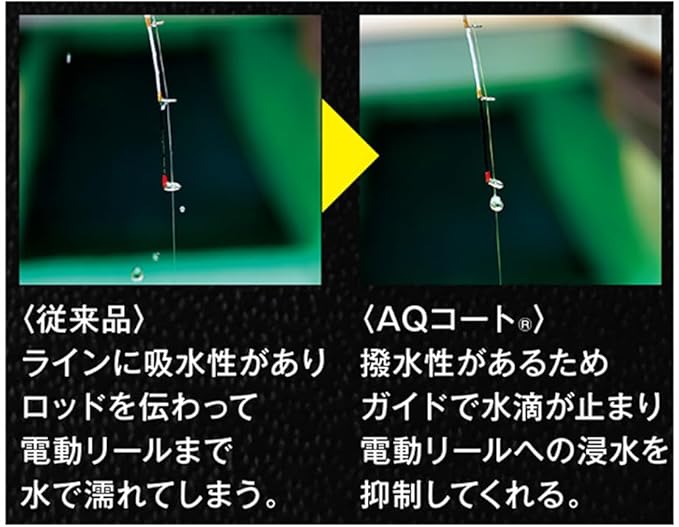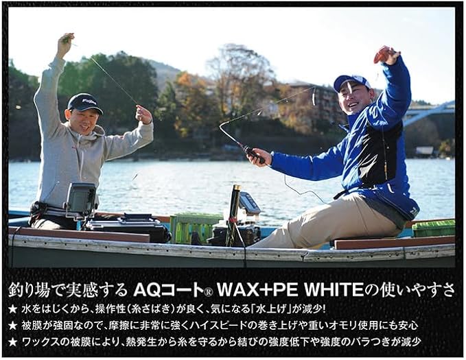 【AQコート】・・・○水をはじくから、操作性(糸さばき)が良く、気になる「水上げ」が減少! / ○被膜が強固なので、摩擦に非常に強くハイスピードの巻き上げや重いオモリ使用にも安心 / ○ワックスの被膜により、熱発生から糸を守るから結びの強度低下や強度のバラつきが減少 / ○植物由来100%の特殊ワックスコートだから環境にもやさしく、安心して使えます。