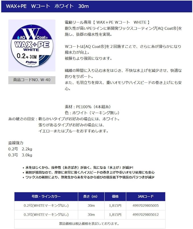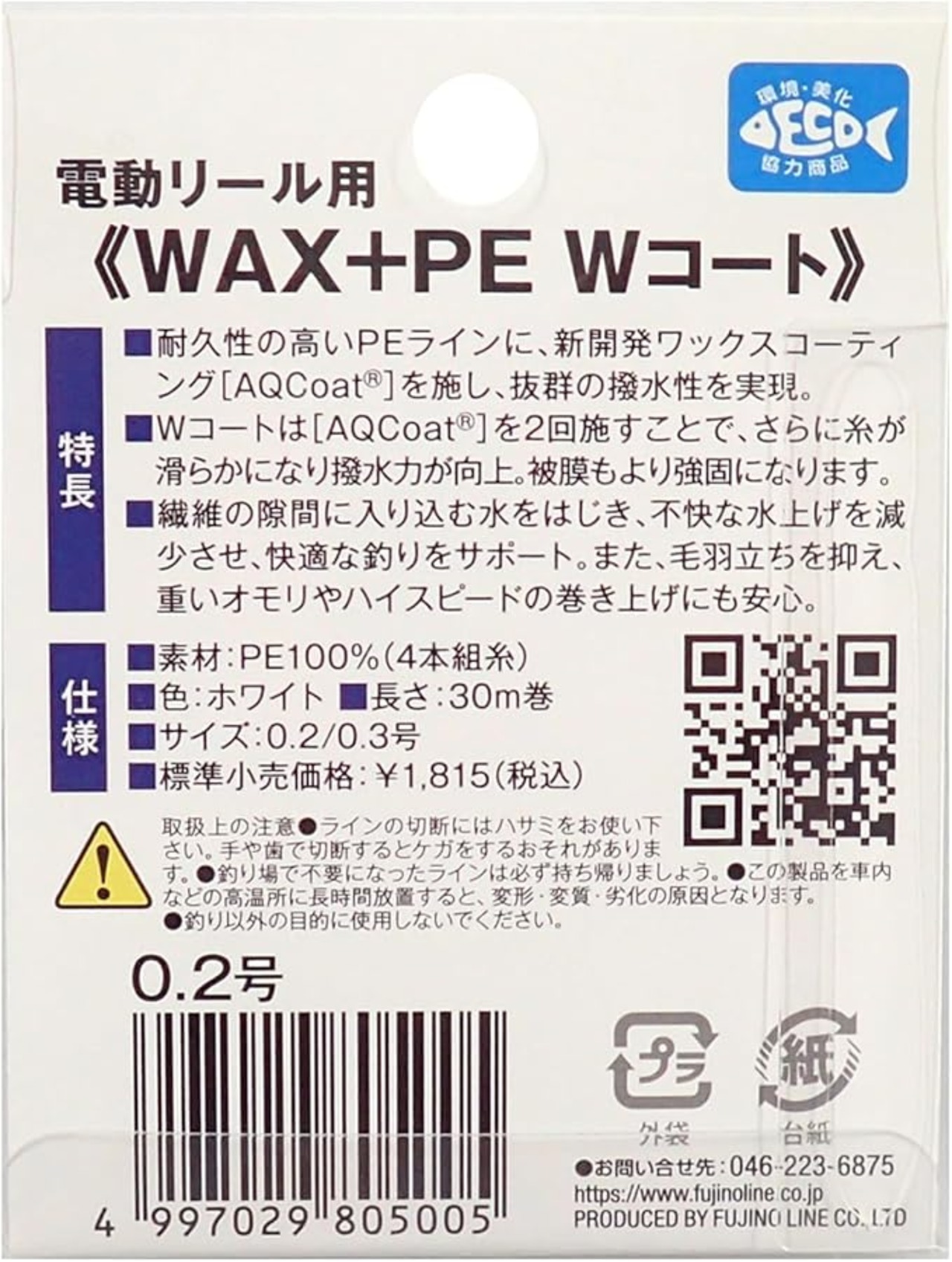 耐久性の高いPEラインに独自の新開発ワックスコーティング「AQ Coat(R)」を2回施し、従来品以上の水切れ・耐久性を実現。より滑らか且つ均一な仕上がりとなった電動リール専用PEライン!