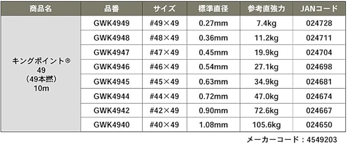 標準直径:1.08mm (参考直強力: 約105.6kg)