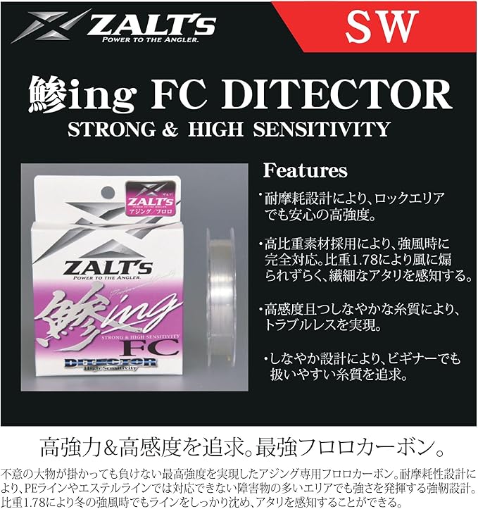 高強力&高感度を追求、最強フロロカーボン。<br>不意の大物が掛かっても負けない最高強度を実現したアジング専用フロロカーボン。<br>アジングでは小型青物などがヒットするケースは少なくない。<br>そのようなシチュエーションでも安心してファイトができる最高強度を兼ね揃えたフロロカーボンライン。<br>比重1.78により冬の強風時でもラインをしっかり沈め、アタリを感知することができる。