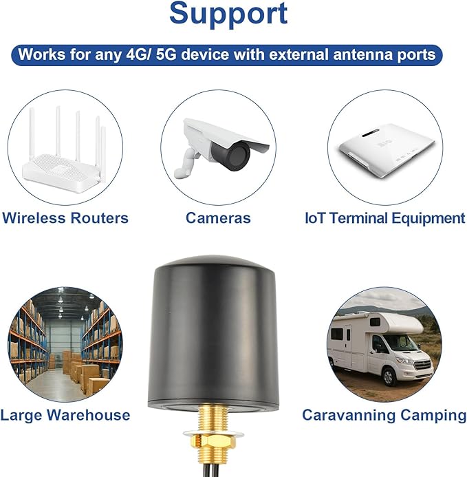 日本主要4G/5G周波数に対応:600-6000MHzの広帯域で、主なバンド(Band 1/3/8/18/19/28/41)をカバーします。デュアルMIMO技術でより高速な通信を実現します。複数データストリームを同時に処理し、遅延が低減されるため、4Kストリーミングのスムーズな再生、ラグのないビデオ通話、複数デバイスの安定した接続が可能となります。リモートオフィス、RVインターネット、IoT監視システムに最適です。