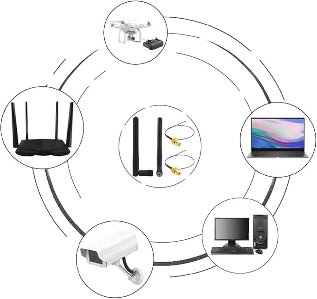 ✿2.4GHzおよび5.8GHzの周波数標準に準拠し、ほとんどのデバイスに対して、ルーター、アクセスポイント、シグナルブースター、ワイヤレスデスクトップカード、セキュリティカメラ、監視DVRレコーダー、ワイヤレスRVバックカメラ、リアビューカメラシステム、FPVドローンコントローラーおよびレシーバー、FPVカメラモニター。