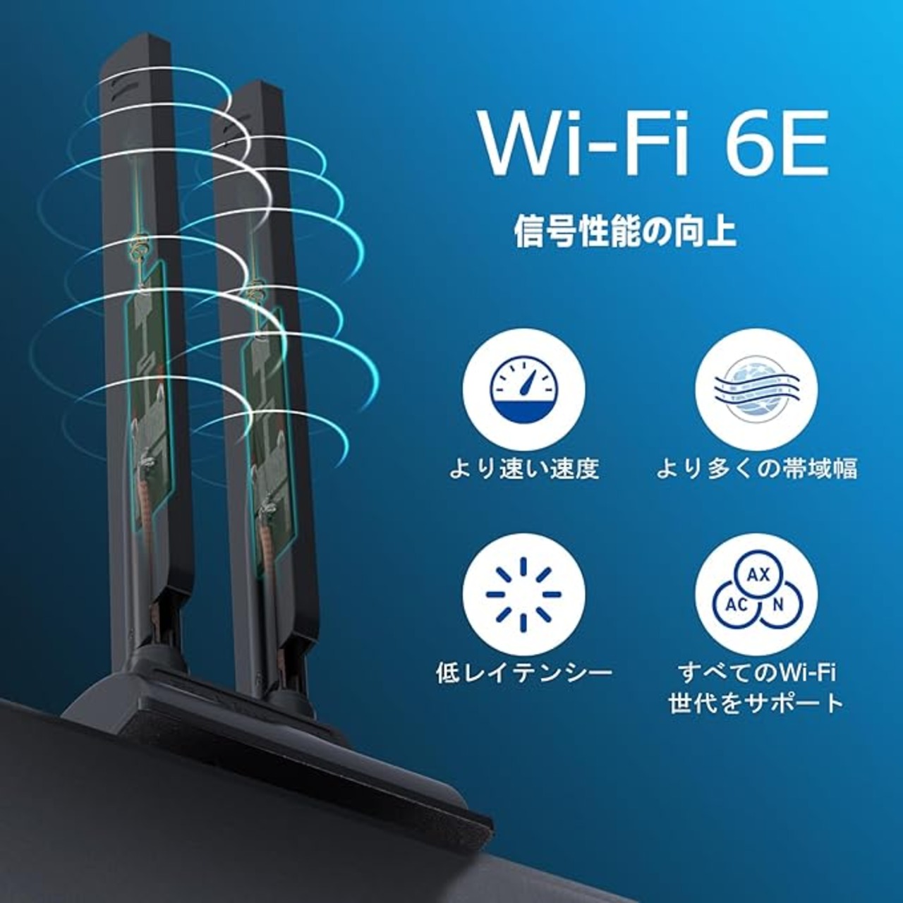 トライバンドWiFi接続:アンテナは3つの周波数帯域(2.4GHz(2400~2500MHz)、5GHz(5150~5850MHz)、6GHz(5900~7125MHz))をサポートし、802.11 b/g/n/ac/ax/WiFi 6/WiFi 6eと互換性があります。