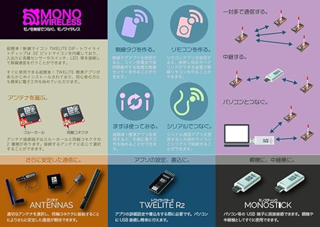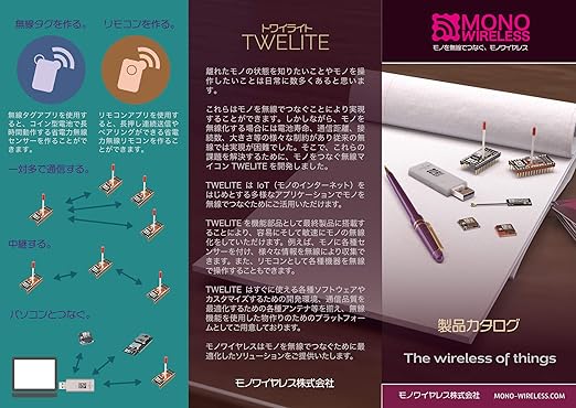 ・主な仕様・ソフトウェア:「超簡単!TWELITE標準アプリ」をインストール済み・無線方式:2.4GHz、IEEE802.15.4準拠