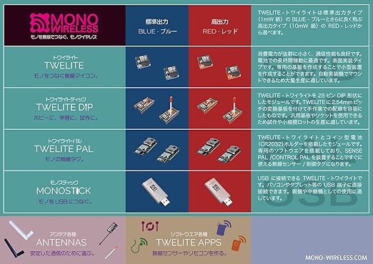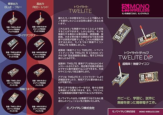 ・TWELITE DIPシリーズには、標準出力タイプ(1mW級)のTWELITE BLUEと高出力タイプ(10mW級)のTWELITE REDがあり、それぞれにマッチ棒アンテナが実装済みのタイプと未実装のタイプが用意されています。
