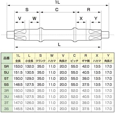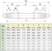 メーカー 中谷金属工業 サイズ 5R:全長153.0mm ギヤ側42.0mm 5U:全長151.5mm ギヤ側40.5mm 5T:全長150.0mm ギヤ側39.0mm 5S:全長148.5mm ギヤ側37.5mm ピッチは全て55.0mm