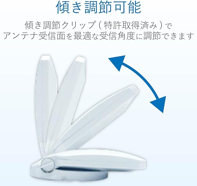 独自の傾き調整クリップで、アンテナ受信面を0~90度の範囲で無段階に調整、固定が可能