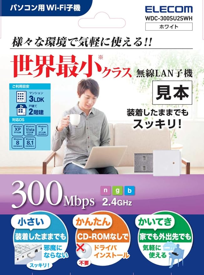 IEEE802.11b/g/nに対応し、最大300Mbpsの無線通信が可能です。業界標準の2.4GHz通信に対応し、宅内のルータはもちろんの事、Wi-Fiスポットやポケットルータなど幅広い環境で使えます。装着したまま持ち運んでも邪魔になりません。