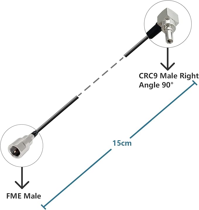 コネクタ1:FMEオスストレート | コネクタ2:CRC9オス直角90度 | ケーブルタイプ:RG174 | ケーブル長:15cm/6インチ | インピーダンス:50オーム;