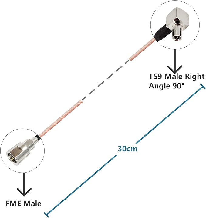 コネクタ1:FMEオスストレート | コネクタ2:TS9オス直角90 | ケーブルタイプ:RG316 | ケーブル長:30cm/11.8インチ | インピーダンス:50オーム;